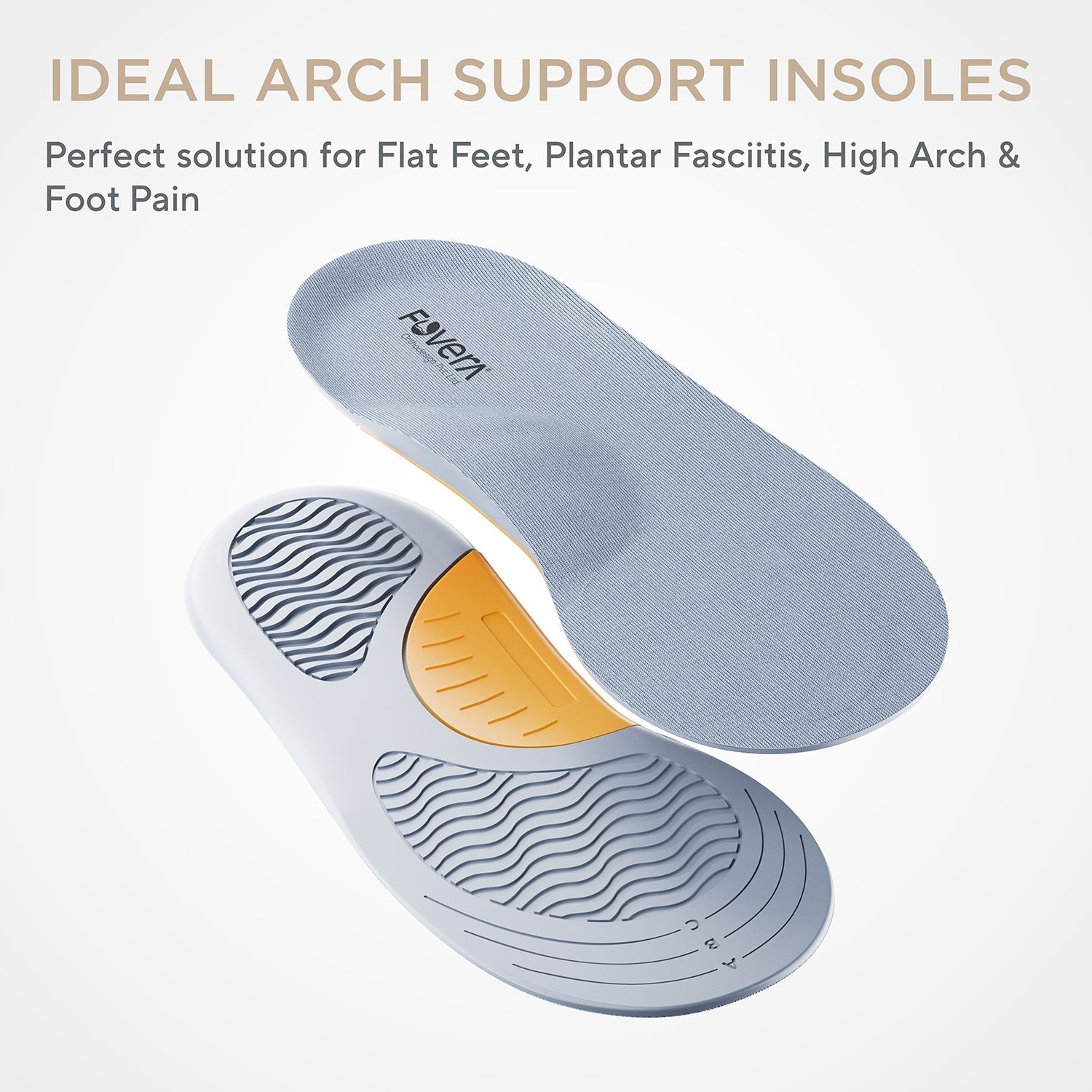 • IDEAL FLAT FEET INSOLE: FOVERA Arch Support Gel Insoles are an ideal orthotic for people with Flat Feet Syndrome, Plantar Fasciitis, Foot Pain, and Fallen Arches. Innovative insole design provides a natural arch that improves foot and leg alignment.