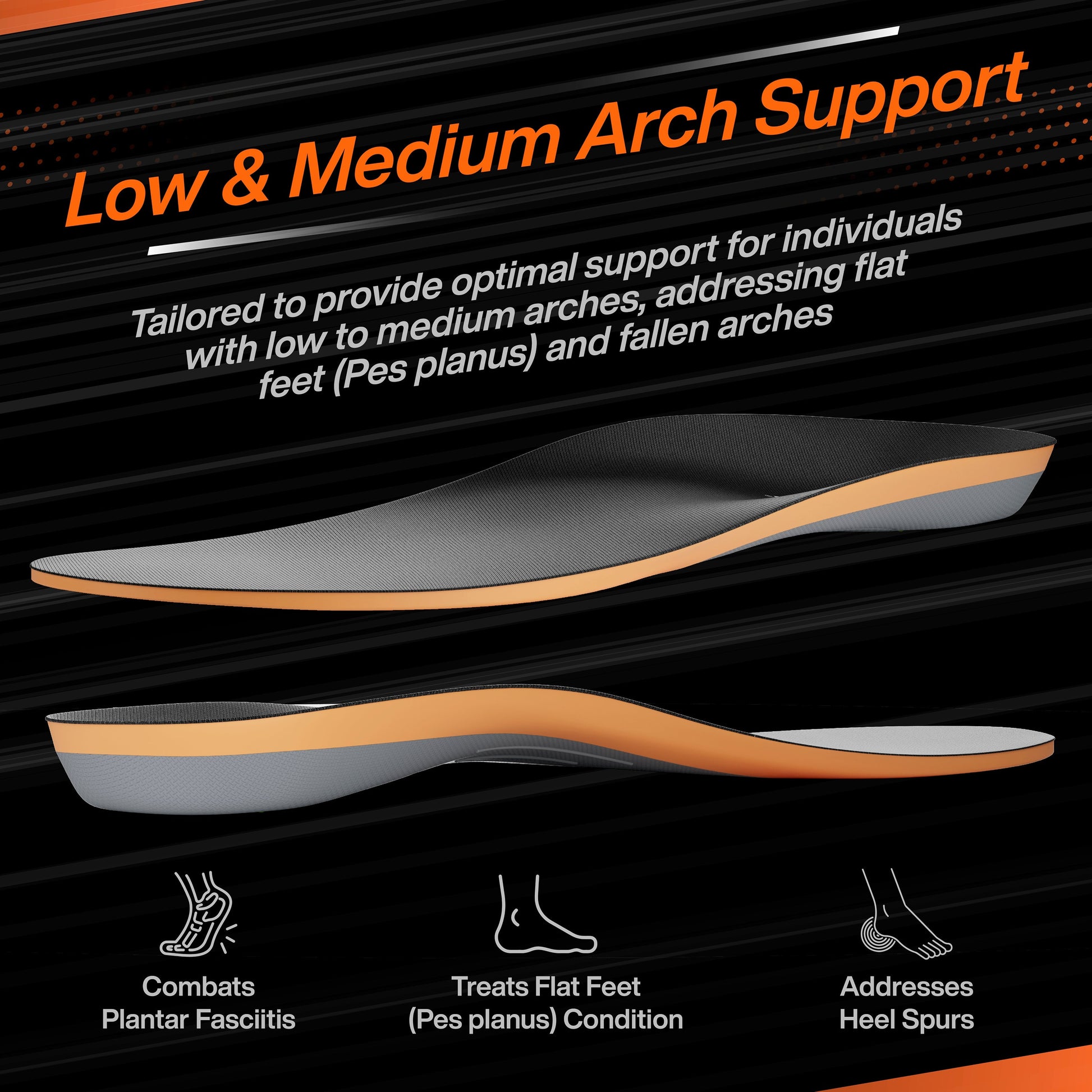 • LOW & MEDIUM ARCH SUPPORT: Enhance your comfort and alleviate foot pain with FOVERA Medium Arch Support Insoles. Designed specifically for flat feet (Pes planus), fallen arches, plantar fasciitis, and heel spurs, these insoles provide optimal support to the midfoot, promoting a natural and balanced foot alignment.